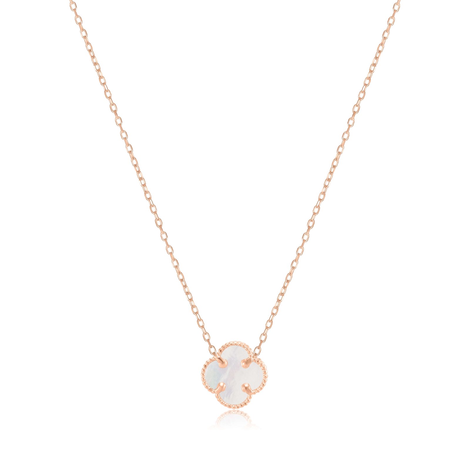 This elegant clover-shaped gold chain with pendant is made of genuine 585 gold and natural mother-of-pearl stone. This gold chain with a pendant stands out for its delicate design and luxury, and the white mother-of-pearl adds exclusivity and sophistication.