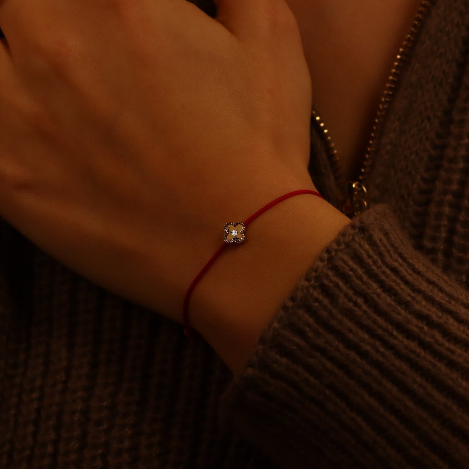 Šī baltā diegu aproce ar āboliņu un dabīgo dimantu simbolizē veiksmi, mīlestību un iekšējo spēku. Tā ir izgatavota no augstas kvalitātes diega, dabīgā dimanta un 14k (585 smalkā) zelta - šo materiālu kombinācija nodrošina izturību un nevainojamu estētiku.