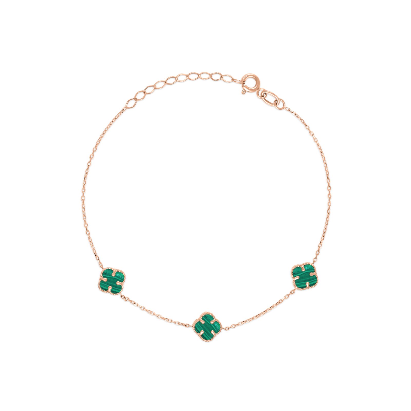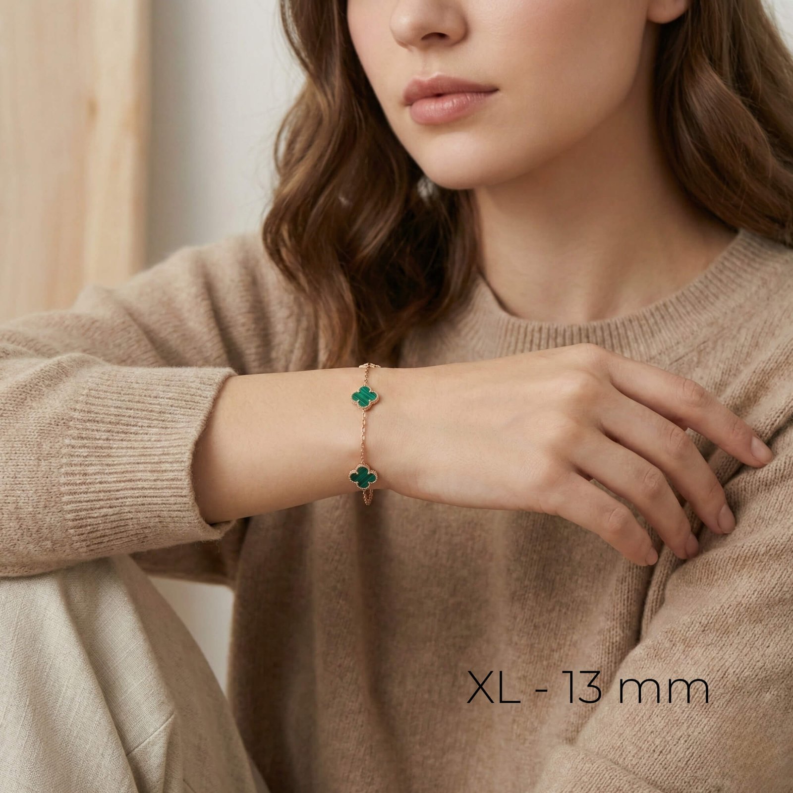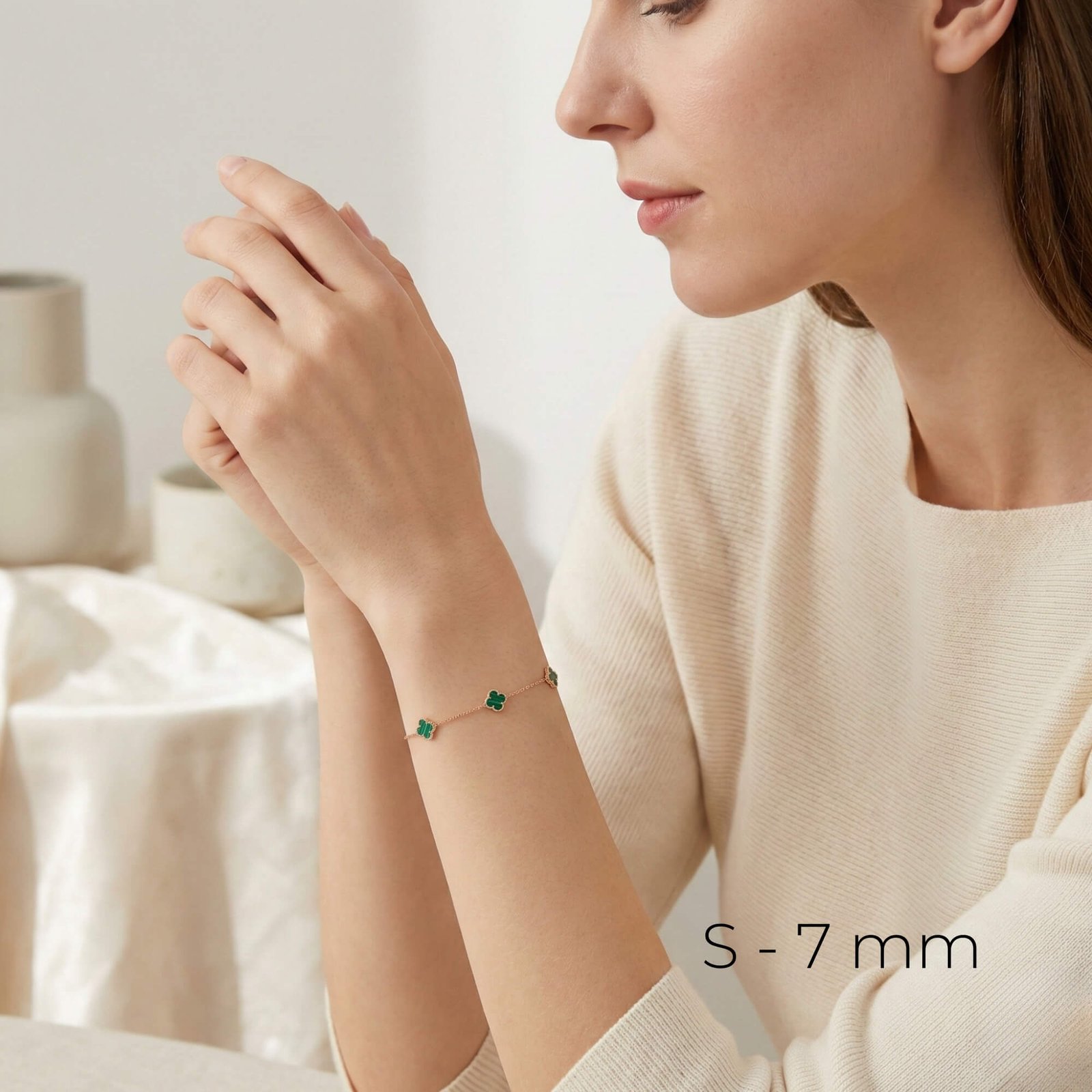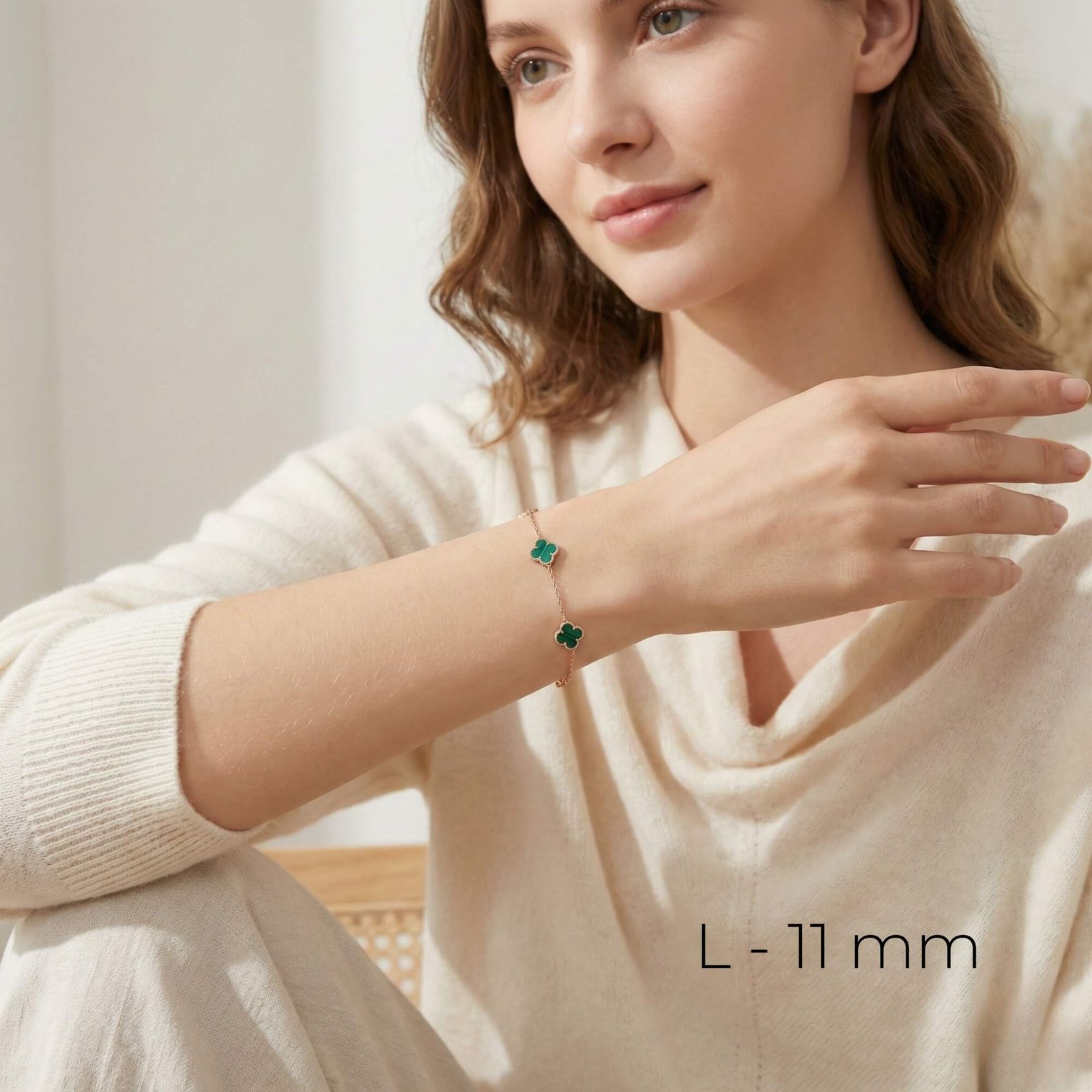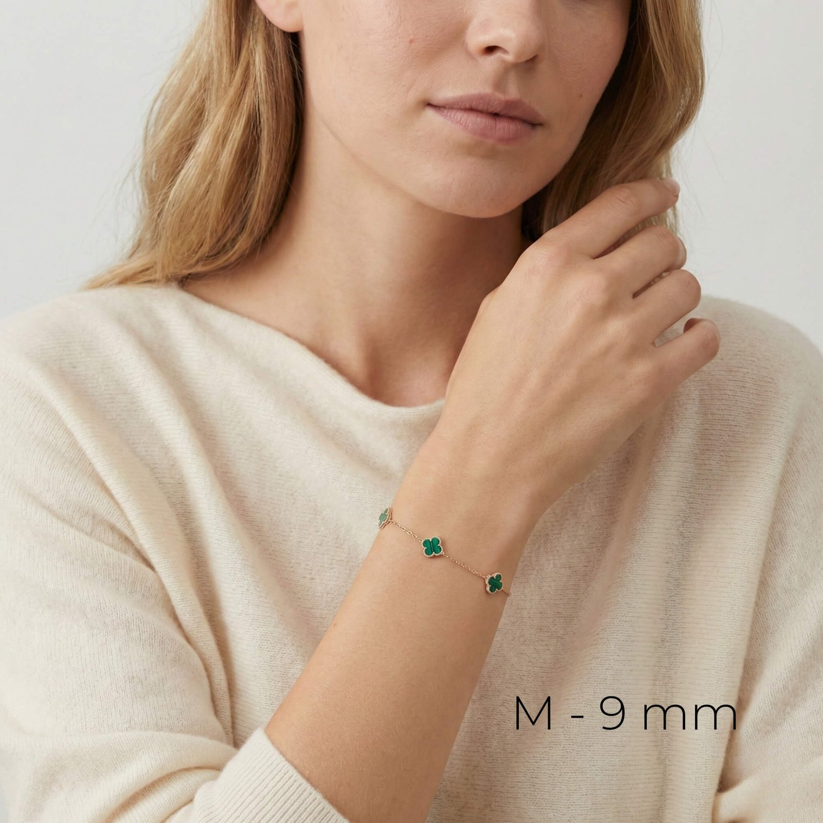 Ta elegancka koniczyna złota bransoletka jest wykonana z prawdziwego złota próby 585 i naturalnego kamienia malachitu. To właśnie ta złota bransoletka wyróżnia się delikatnym wzornictwem i luksusem, podczas gdy zielony malachit dodaje ekskluzywności i wyrafinowania.