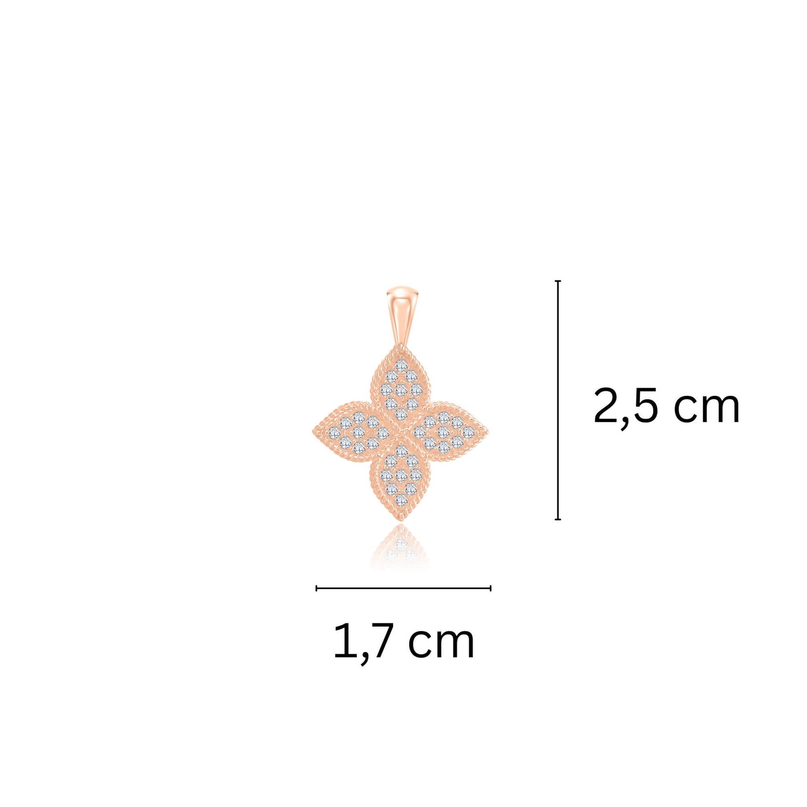 Wykwintnie zaprojektowany wisiorek wykonany jest z czerwonego złota próby 585, urzekający delikatnymi kształtami i luksusowo błyszczącymi detalami. Wzór w kształcie kwiatu przypomina czterolistną koniczynę - symbol szczęścia i sukcesu, więc ta biżuteria nie tylko zdobi, ale także ma szczególne znaczenie.